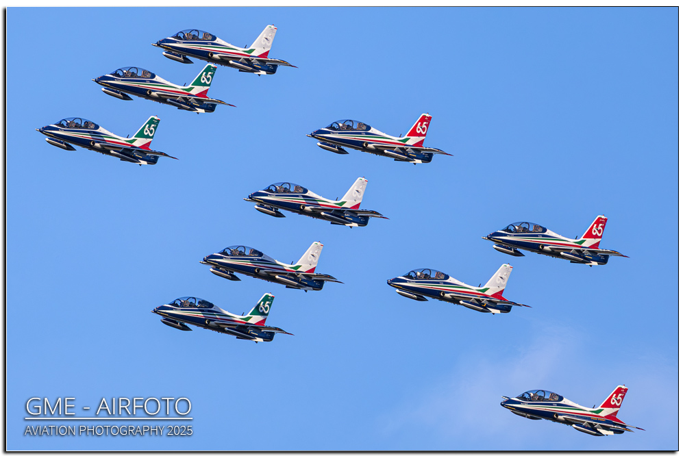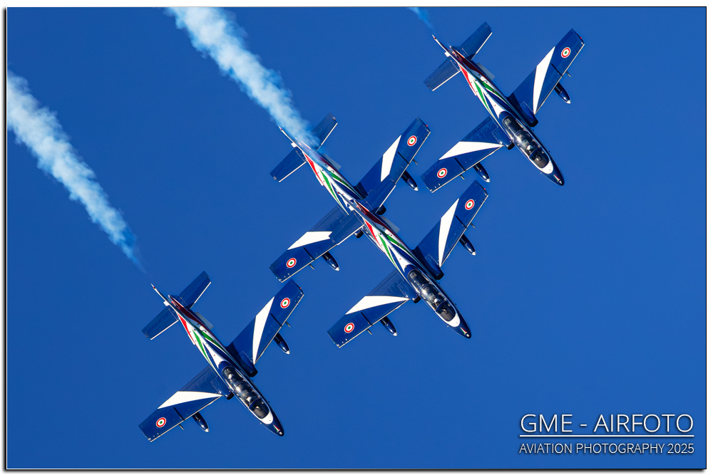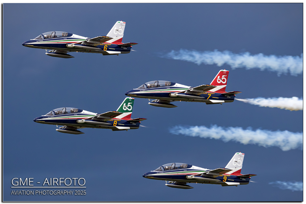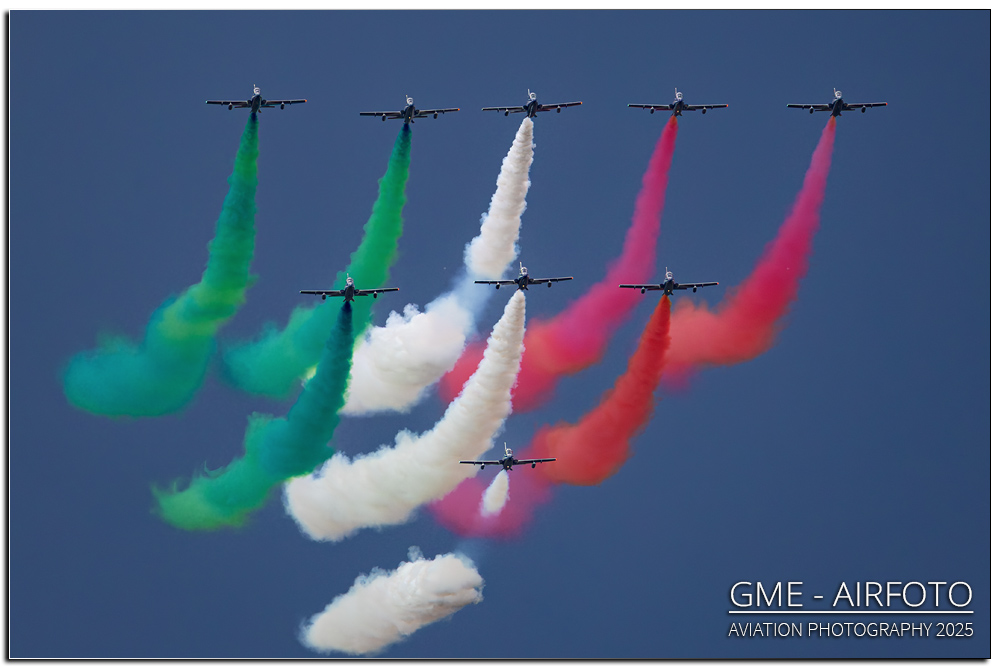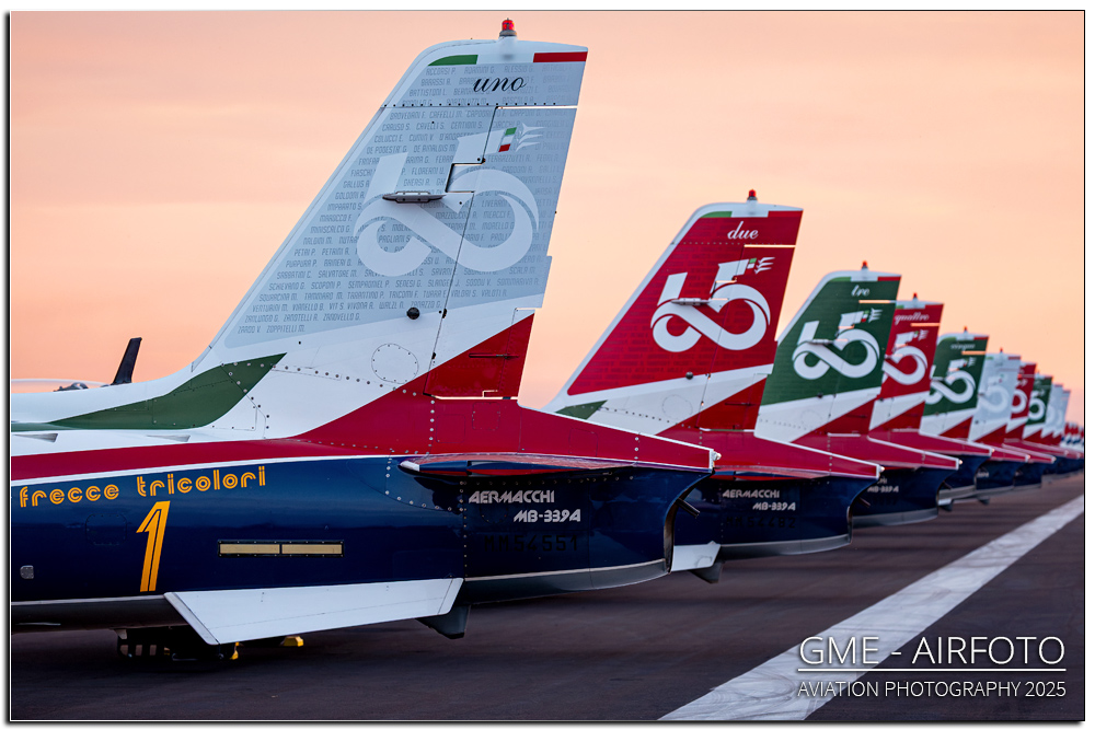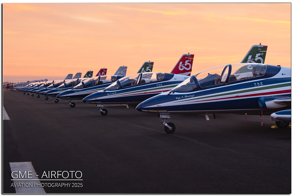 Mit einer großen, internationalen Airshow feierten die Frecce Tricolori ihr 65 – jähriges Jubiläum auf ihrer Heimatbasis in Rivolto. Zusätzlich wurde die ansässige 2° Stormo 100 Jahre. Land & Leute, ein hochkarätiges Teilnehmerfeld und vor allem das schöne, italienische Spätsommerwetter trugen ihren Teil zu einem gelungenen Event bei. Vom 05. bis 07. September 2025 feierten wieder ca. 200.000 Tifosi ihre Nationalhelden.